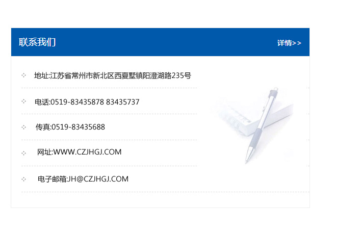 地址:常州市新北區友邦商務大廈1幢16、17層  電話:0519-85101652  傳真:0519-85112595  郵編:213022  網址:www_cz-jiayue_cn.35-dnbc.com  郵箱:xiajifengaa@163.com
